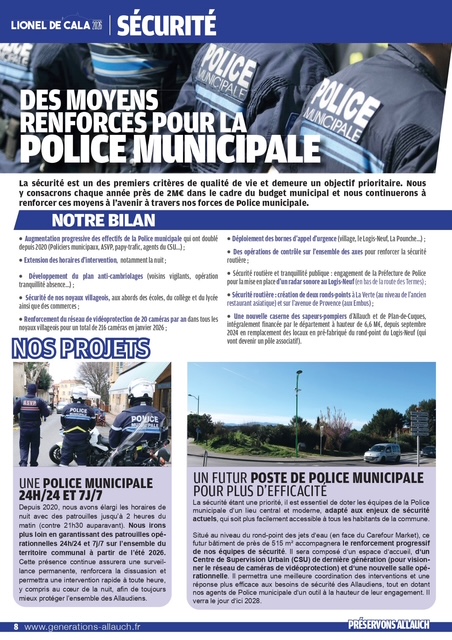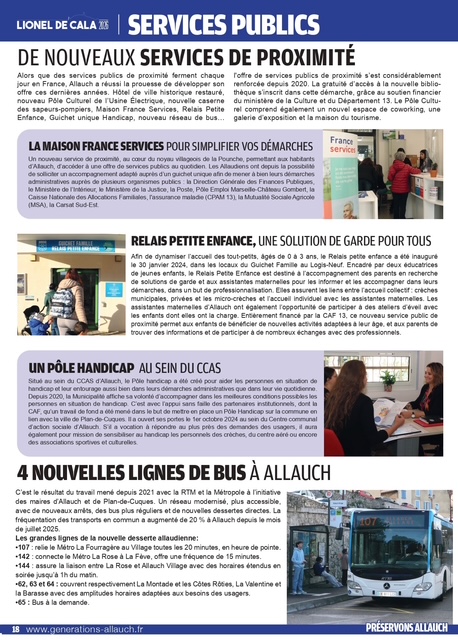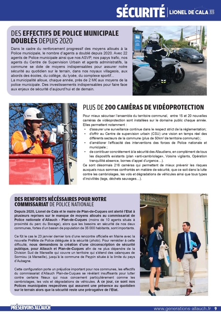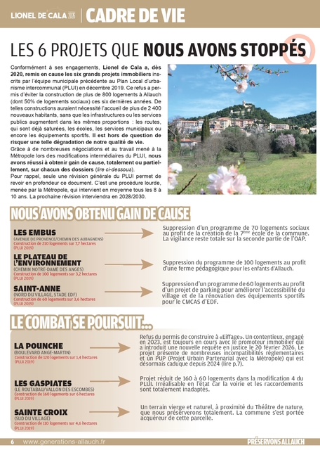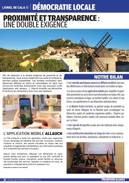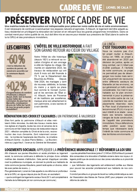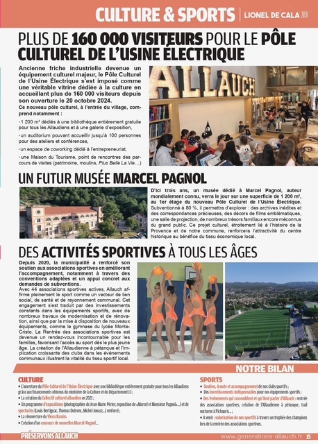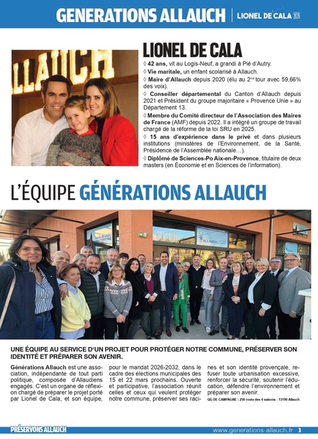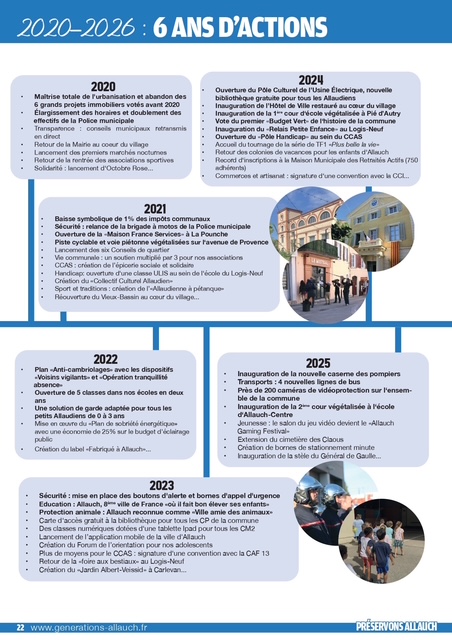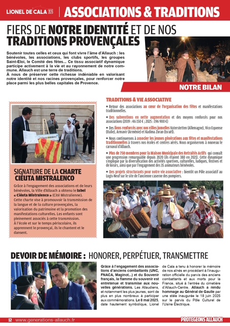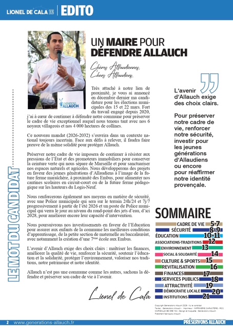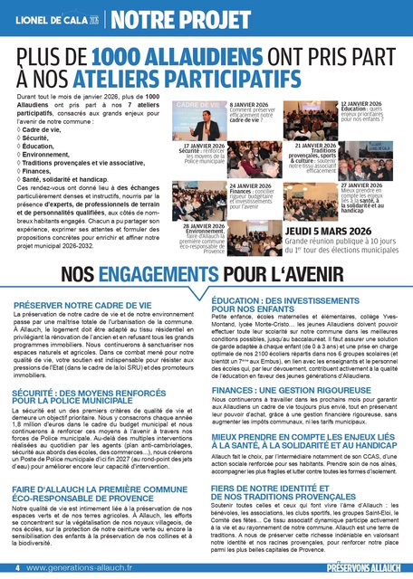 pages (qui a été distribué dans vos boîtes aux lettres ces prochains jours) revient sur les thématiques primordiales pour la défense de notre commune : cadre de vie, sécurité, éducation, environnement, associations, culture, sports, revitalisation de nos noyaux villageois, finances, santé, traditions provençales, services publics, démocratie locale…