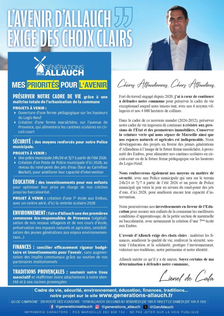 Nos priorités pour Allauch : consultez le projet de l’équipe de Générations Allauch pour l’avenir de notre commune ! NOTRE PROJET ICI